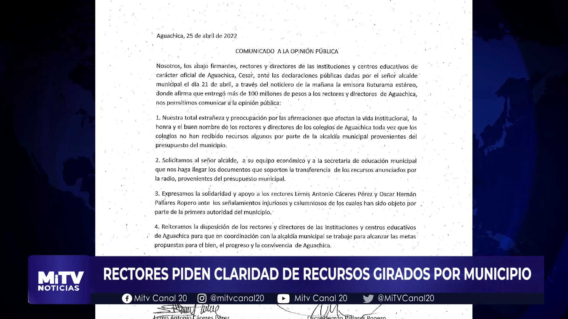 A través de un comunicado a la opinión pública, rectores y directores de las diferentes instituciones oficiales del municipio de Aguachica, se refieren a las declaraciones entregadas por el mandatario municipal en una emisora de la localidad. Según especifican en el documento, el mandatario habría afirmado que realizó la entrega de 100 millones de pesos a los rectores de algunos colegios.